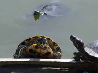 Stowe Lake is the home of many, many turtles. They swim about looking for something to eat, but most of the time, the turtles like to climb up on the logs or rocks that are on the shore and sun themselves. They are usually very still.